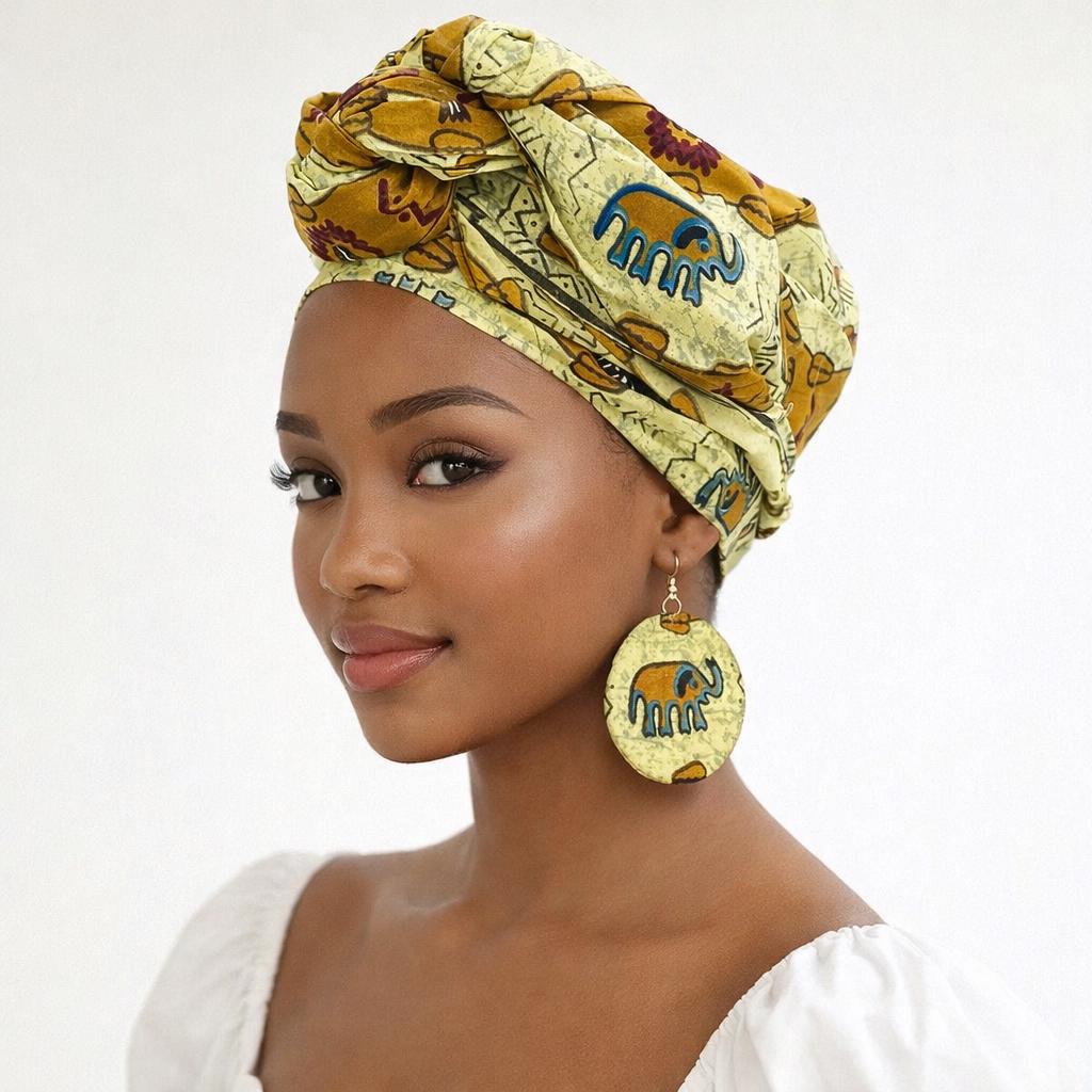 This African head wrap for women is made of Ankara fabric. Beautiful items representing Africa as well as the image of the elephant makes this head wrap versatile, stylish and beautiful! Earrings shown are 3”. Earrings are 2-sided! They may differ from the ones shown due to the cut of the fabric. Back and front may differ giving you two earrings! Design of the earrings vary by size of earrings.